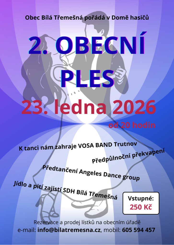 Obec Bílá Třemešná pořádá ples, který se uskuteční 23. ledna 2026 od 20:00 v Domě hasičů. Vstupné činí 250 Kč. Vstupenky si můžete zakoupit a rezervovat na obecním úřadě. Pro více informací využijte e-mail nebo telefonní kontakt.