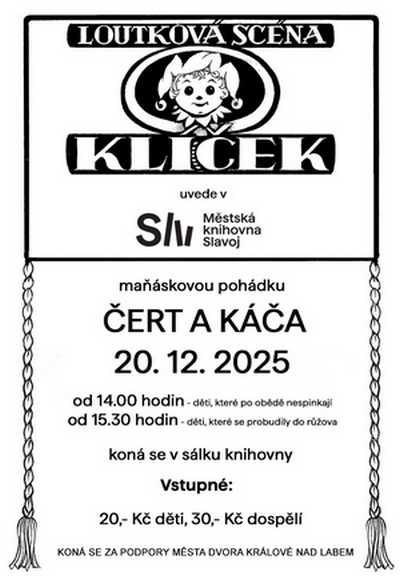 Přijďte si užít maňáskovou pohádku Čert a Káča, která se koná 20. prosince 2025 od 14:00 hodin v sálku knihovny. Po pohádce si můžete vychutnat další vystoupení, které začne v 15:30 hodin.