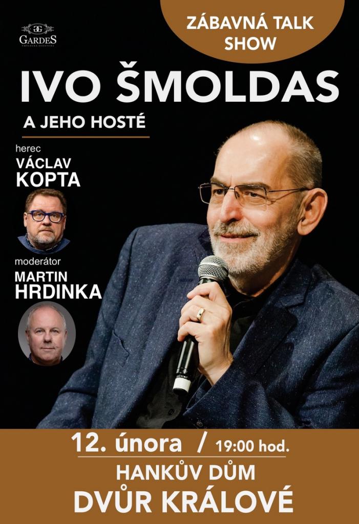 Přijďte si užít zábavnou talk show s Ivem Šmoldasem a jeho hosty, včetně herce Václava Kopty. Akce se koná 12. února 2026 od 19:00 v Hankově domě v Dvoře Králové. Nenechte si ujít skvělou zábavu a inspirativní povídání.